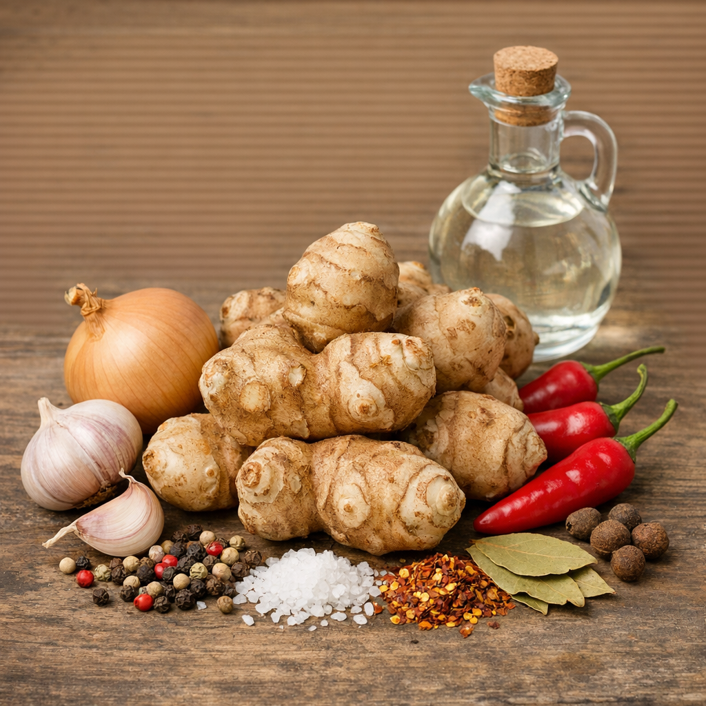 Pikantní topinambur je výrazná zeleninová specialita vyráběná z čerstvého topinamburu, který doplňujeme o chilli, cibuli a pečlivě připravený kořeněný nálev. Díky této kombinaci získává topinambur vyváženou chuť spojující jemnou sladkost, příjemnou pikantnost a typickou křupavost. Skvěle se hodí jako příloha k masu, do burgerů, sendvičů nebo jako součást studené kuchyně.
